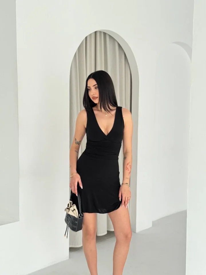 Derin V Yaka Sırt Dekolteli Mini Elbise Drapeli Şık Kolsuz – Siyah