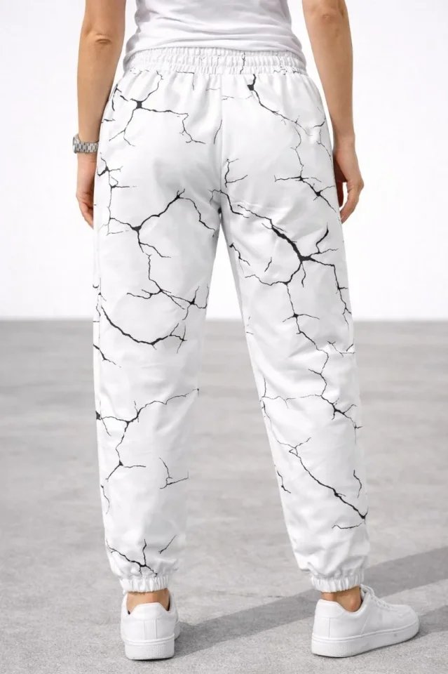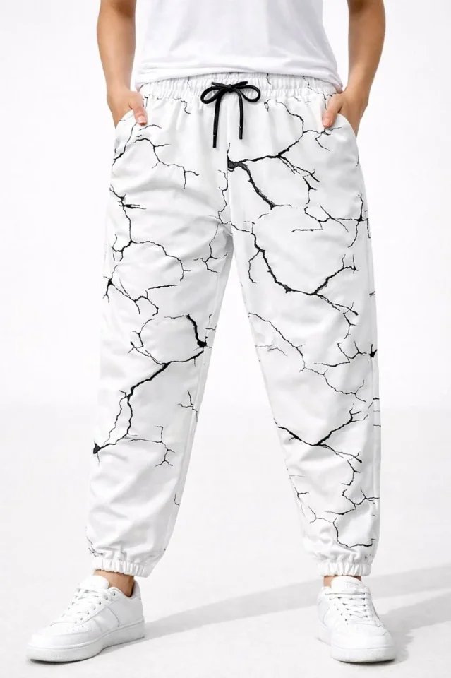 Dijital Baskılı Eşofman Altı Kışlık Üç İplik Şardonlu Kumaş Lastikli Paça, Cepli, Rahat Kalıp – Beyaz