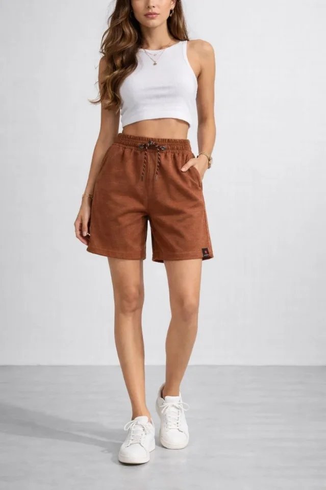 Dokuma Otoban Şort Beli Lastikli Bağcıklı, Cepli, Rahat Kesim Günlük Yazlık Şort – Kahverengi