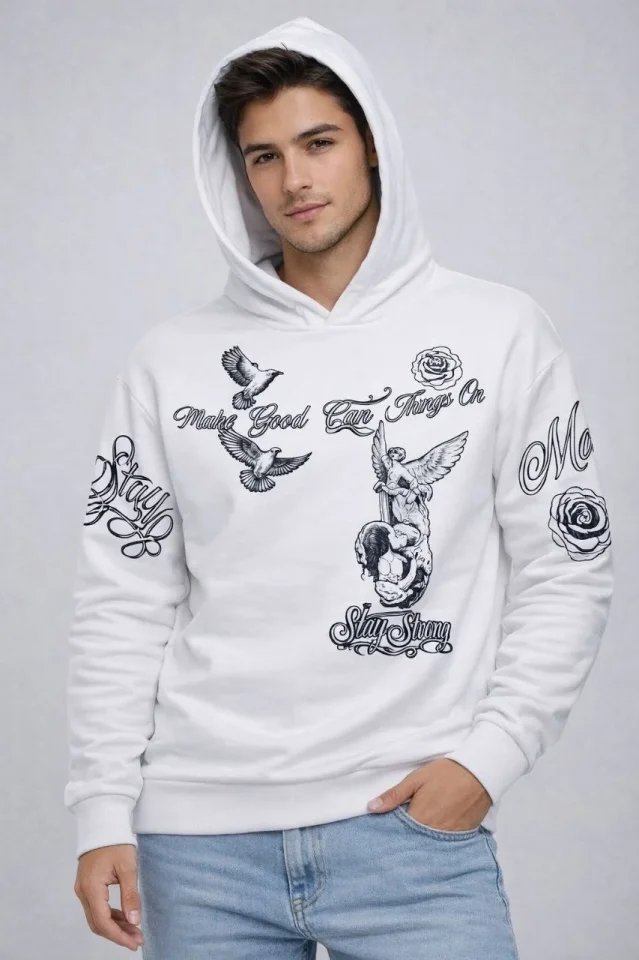 Erkek 3 İplik Pamuklu Kapüşonlu Baskılı SweatShirt Hoodie – Beyaz