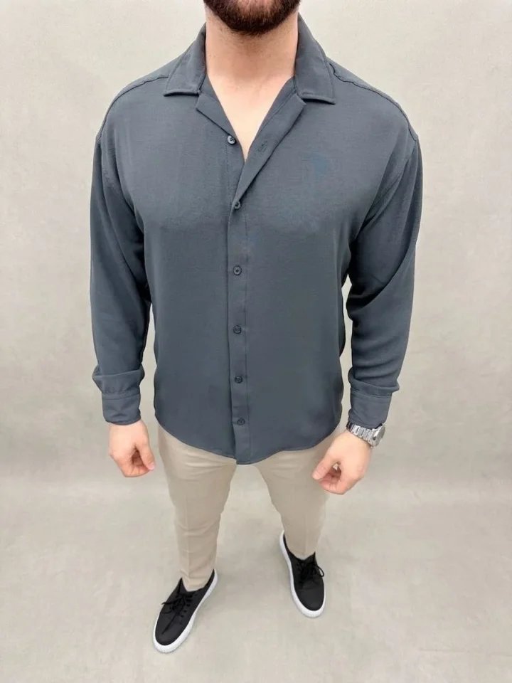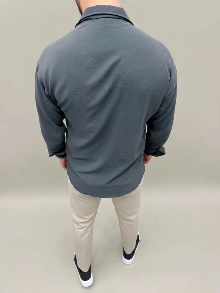 Erkek Aerobin Kumaş Oversize 4 Mevsim Uzun Kollu Rahat Kalıp Gömlek – Füme