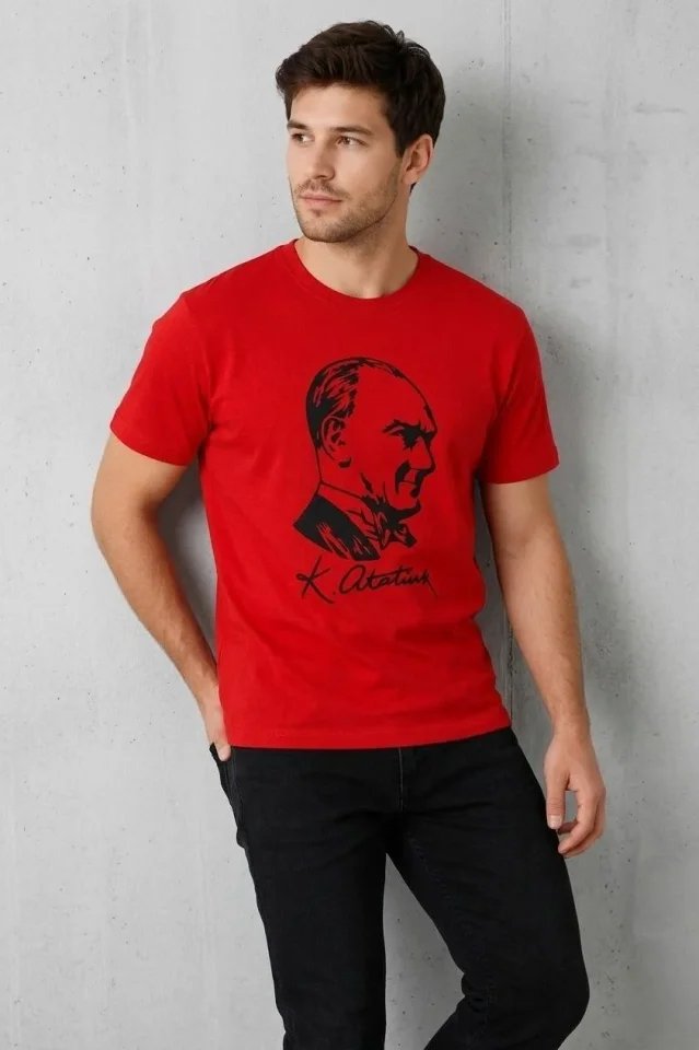 Erkek Atatürk Baskılı Tişört Kısa Kollu Bisiklet Yaka T-Shirt – Kırmızı