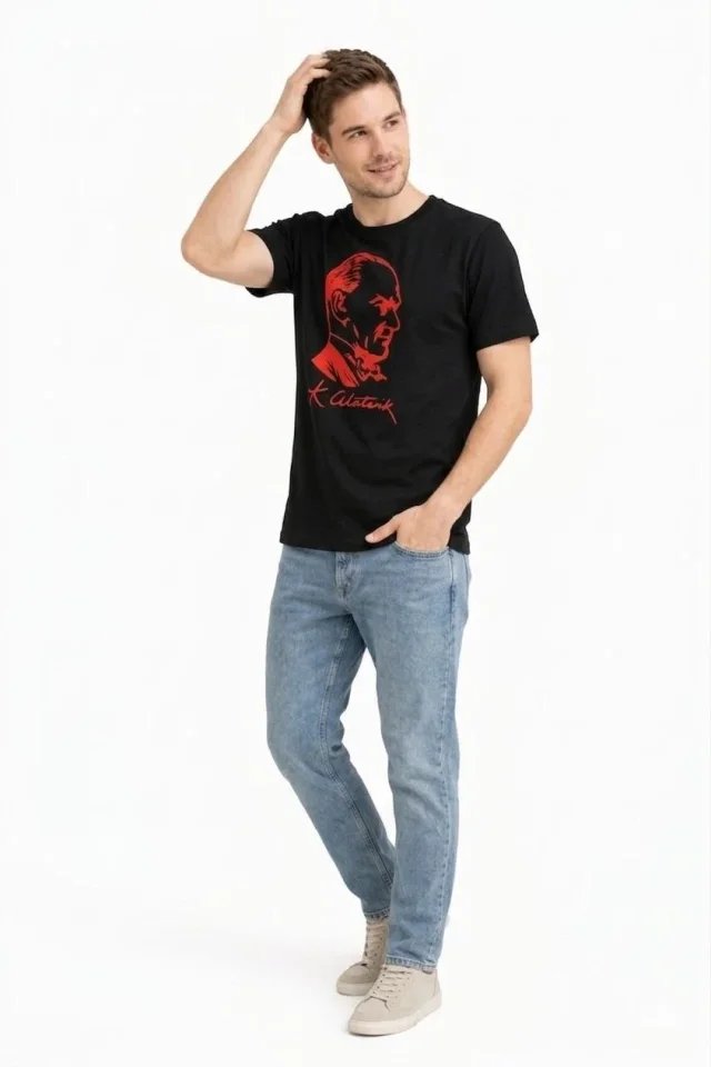 Erkek Atatürk Baskılı Tişört Kısa Kollu Bisiklet Yaka T-Shirt – Siyah