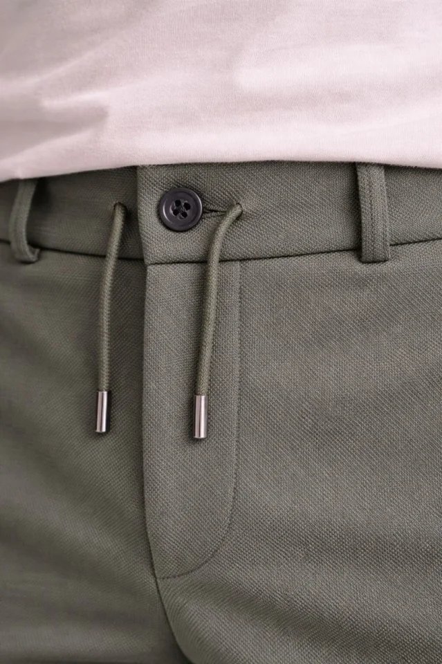 Erkek Diagonel Mikro Dokulu Duble Paça Cepli Pantolon Bağcıklı Bel, Modern Kesim – Haki