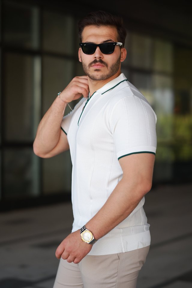 Erkek Göğüs Pirinç Desenli Fermuar Yakalı Kısa Kollu Tişört