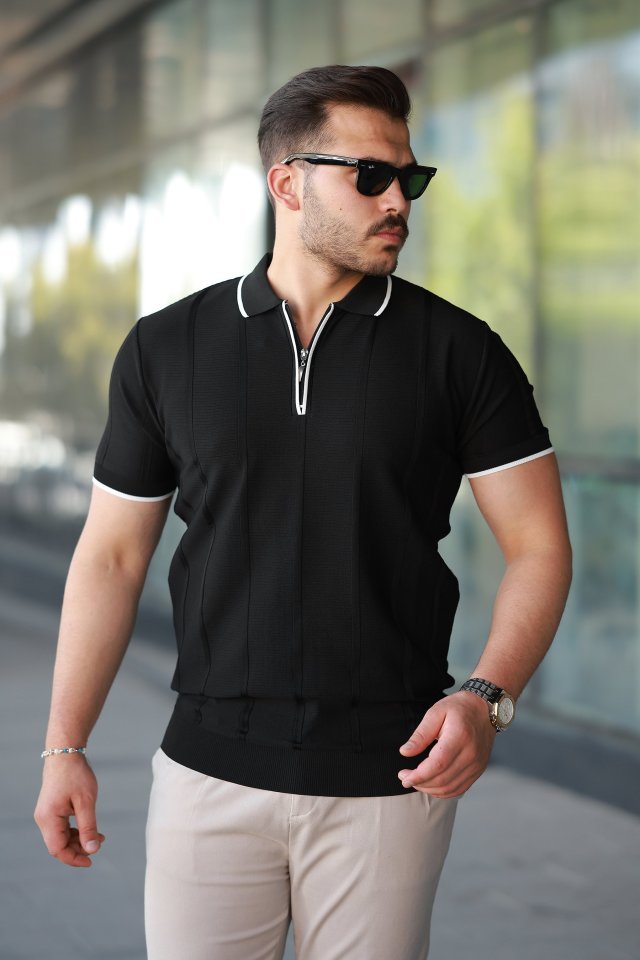 Erkek Dikey Kabartmalı Örgü Dokulu Fermuar Yakalı Tişört