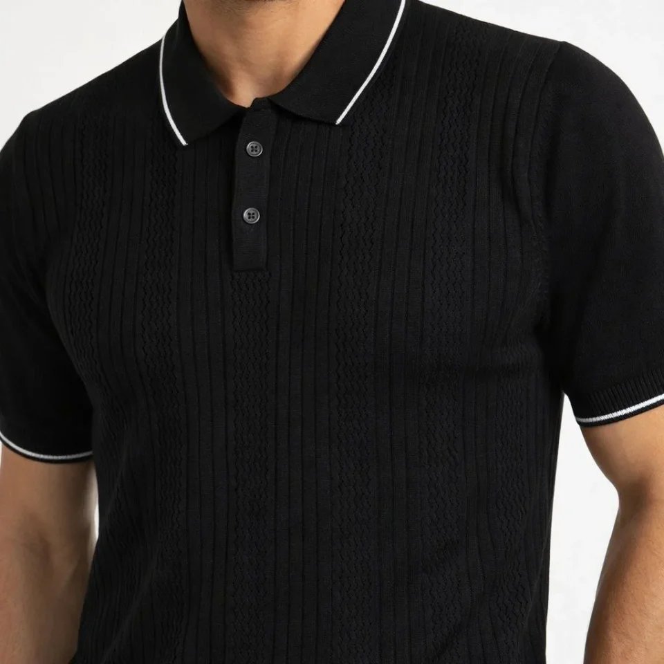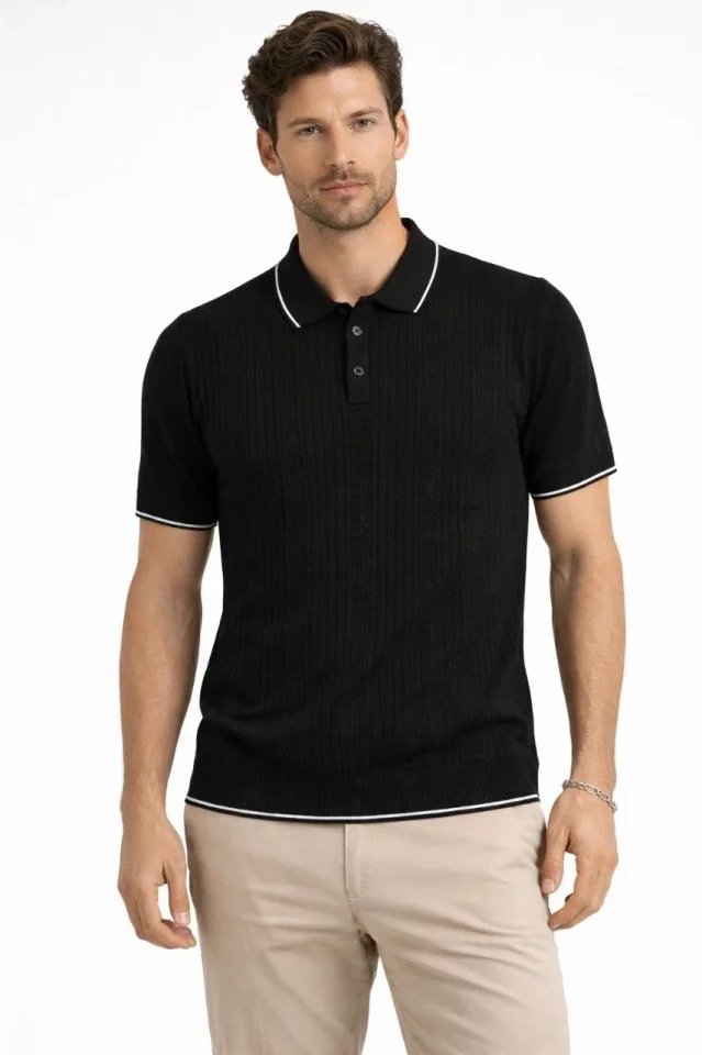 Erkek Düğmeli Yaka Triko Dokuma Tişört Desenli Yazlık Şık Günlük Triko Tişört – Siyah