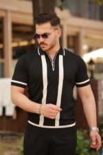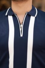 Erkek Fermuar Yakalı şerit Detaylı Kısa Kollu Tişört