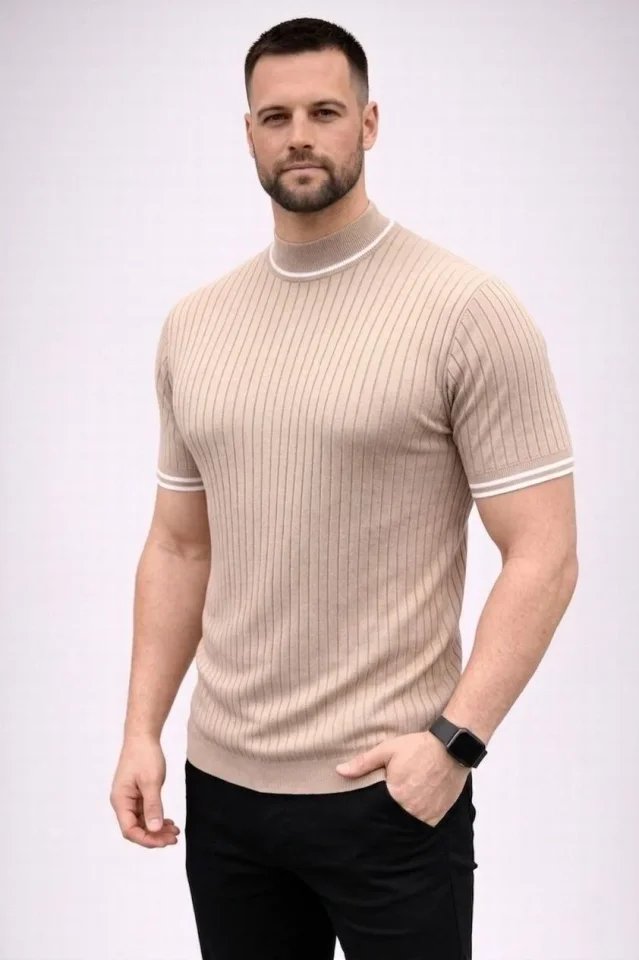 Erkek Fitilli Triko Dokuma Kısa Kol Tişört Yarım Boğaz Modern Yazlık T-Shirt – Bej