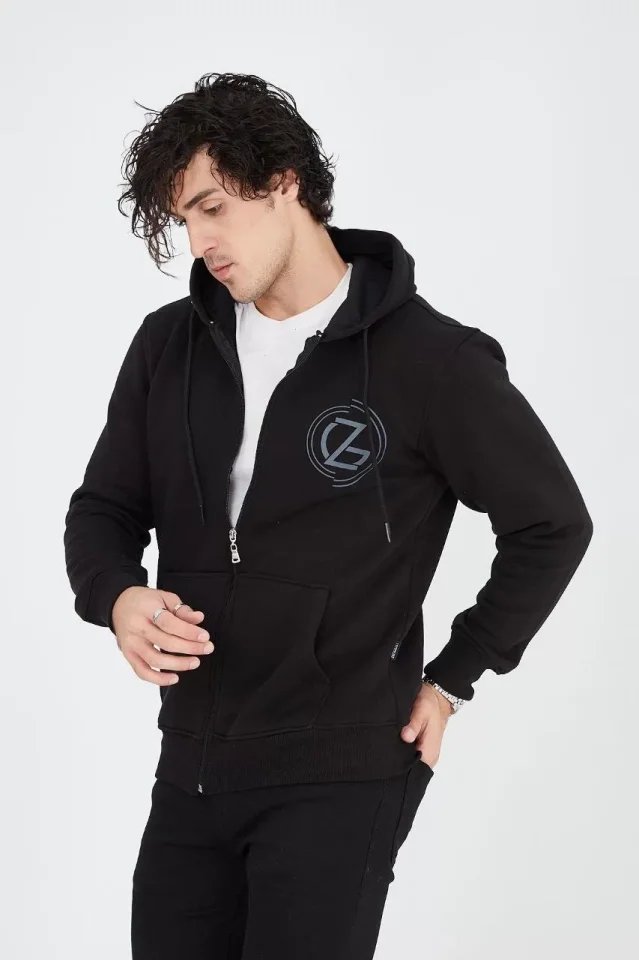 Erkek Kapüşonlu Baskılı Fermuarlı Hırka – Siyah