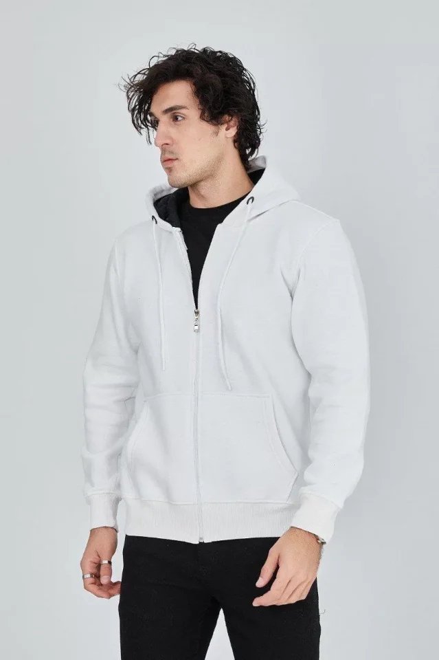Erkek Kapüşonlu Düz Fermuarlı Hırka – Beyaz