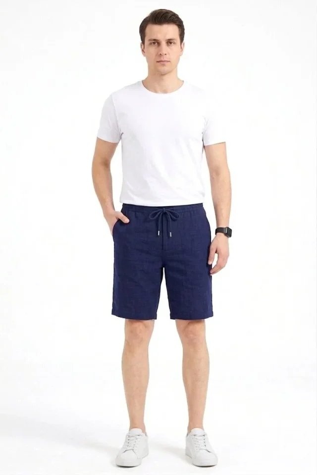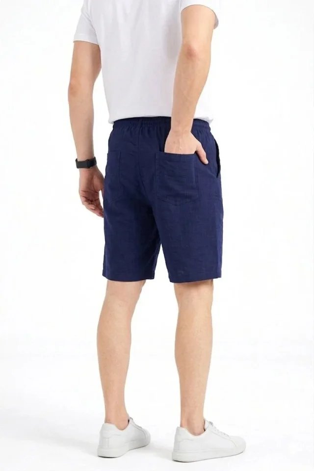 Erkek Keten Kumaş Cepli Rahat Kesim Bel Lastikli Şort – Lacivert