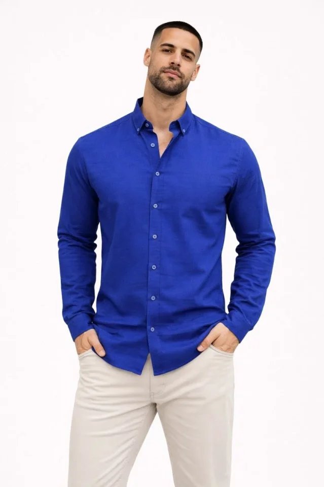 Erkek KETEN Kumaş Oversize Uzun Kollu Rahat Kalıp Gömlek – Saks Mavisi