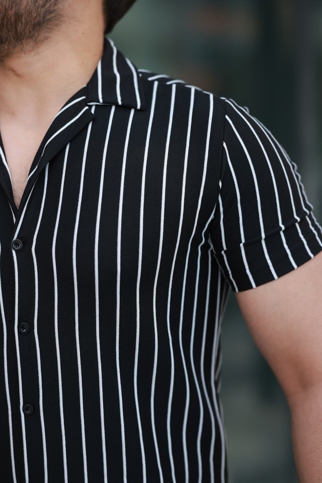 Erkek Kısa Kollu Gri çizgi Desenli örme Kumaş Pamuklu Gömlek