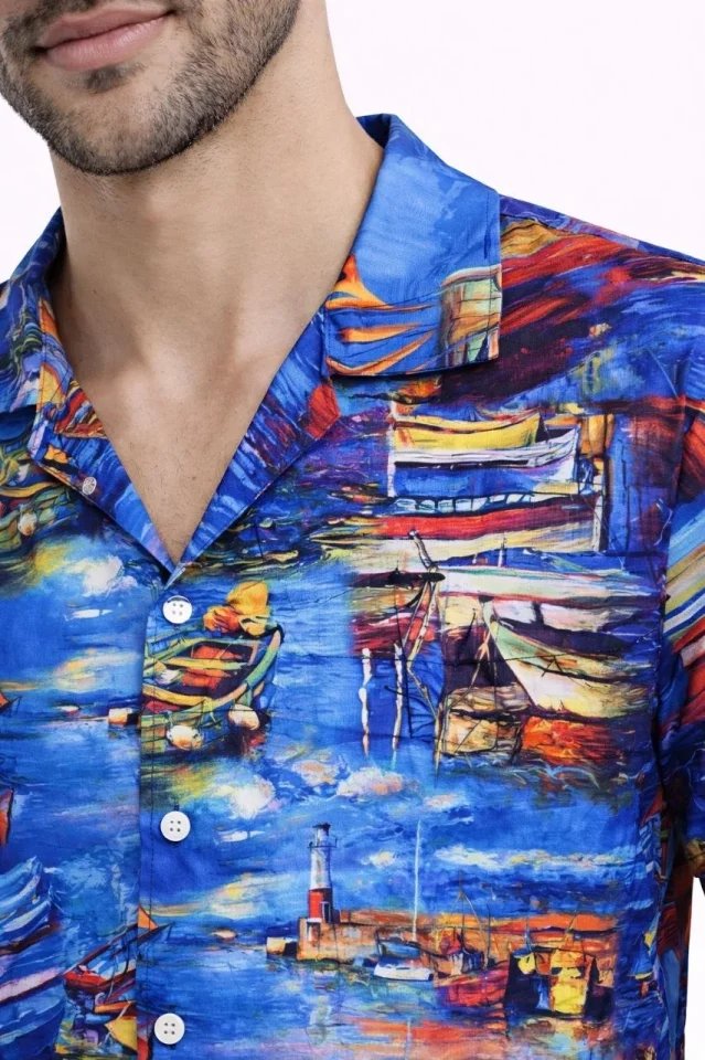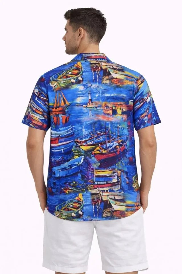 Erkek Marin Desenli Kısa Kol Gömlek Yazlık Rahat Kalıp Dijital Baskılı – Desenli