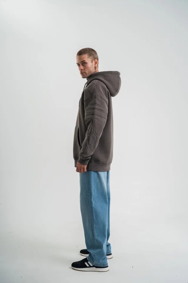 Erkek Nakış İşlemeli Kapşonlu Antrasit Sweatshirt Üç İplik Double Oversize- Füme