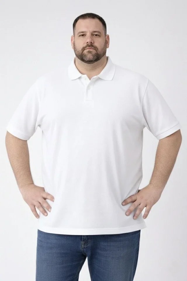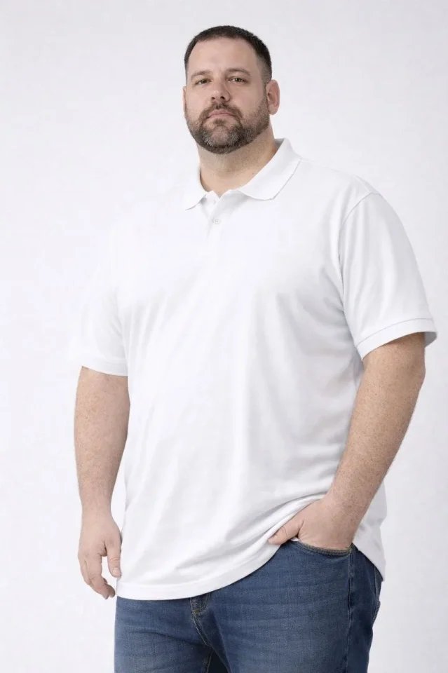 Erkek Pike Kumaş Düğmeli Yaka Battal Büyük Beden Günlük Kısa Kol Tişört T-shirt – Beyaz