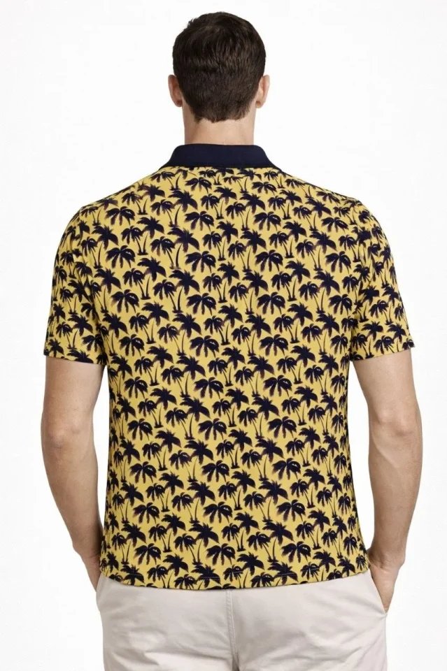 Erkek Pike Kumaş Polo Yaka Palmiye Desenli Tişört Kısa Kol Yazlık T-Shirt – Sarı