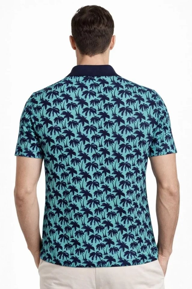 Erkek Pike Kumaş Polo Yaka Palmiye Desenli Tişört Kısa Kol Yazlık T-Shirt – Turkuaz