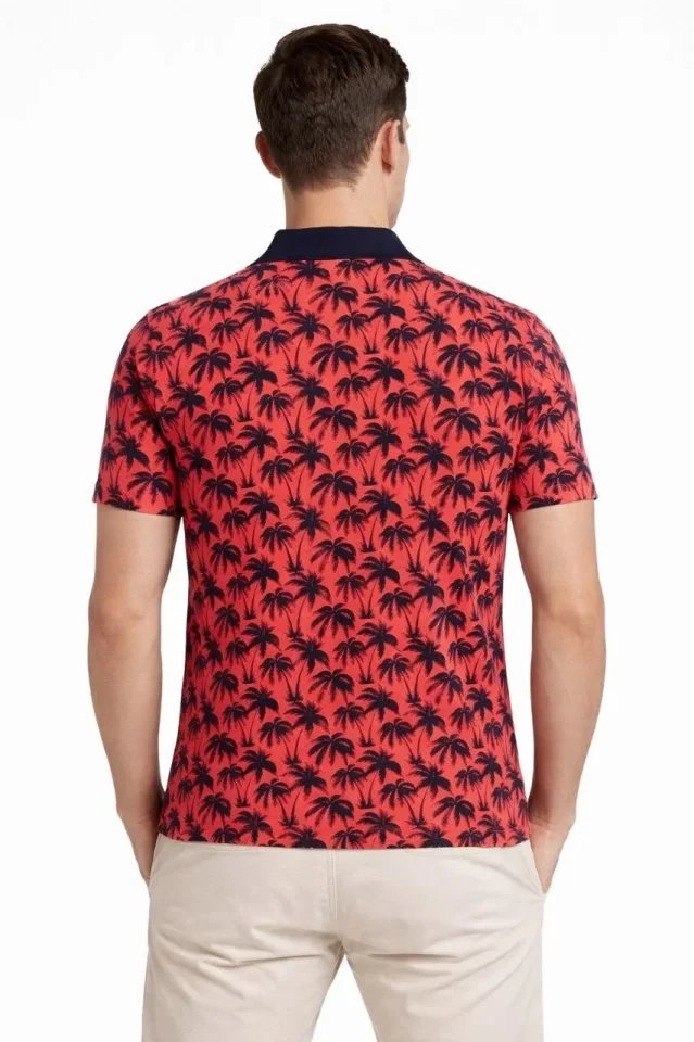 Erkek Pike Kumaş Polo Yaka Palmiye Desenli Tişört Kısa Kol Yazlık T-Shirt – Kırmızı