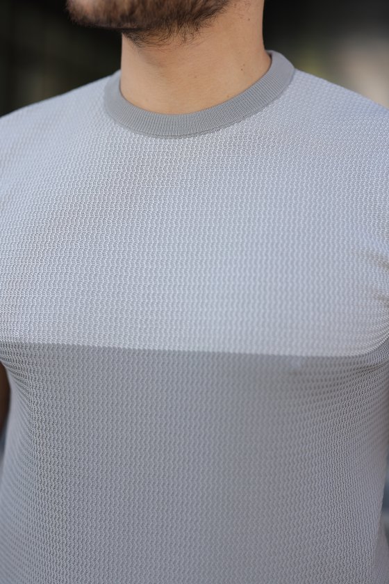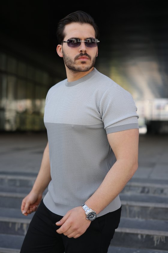Erkek Göğüs Pirinç Desenli Fermuar Yakalı Kısa Kollu Tişört