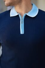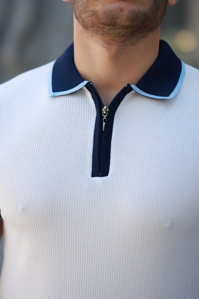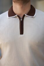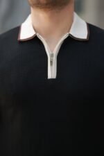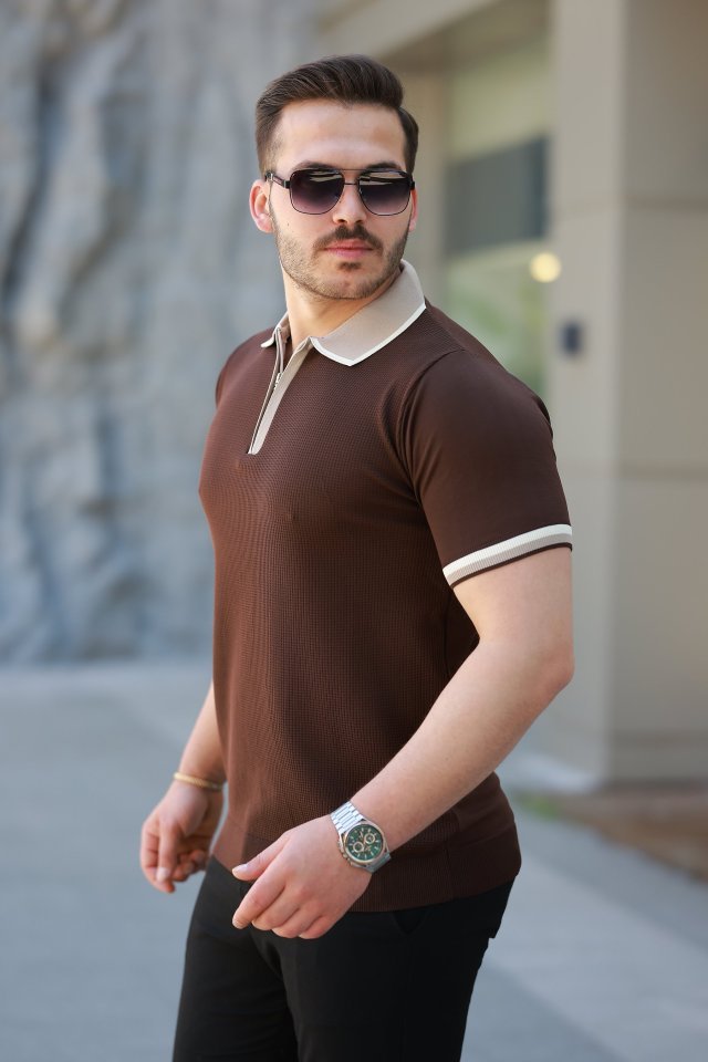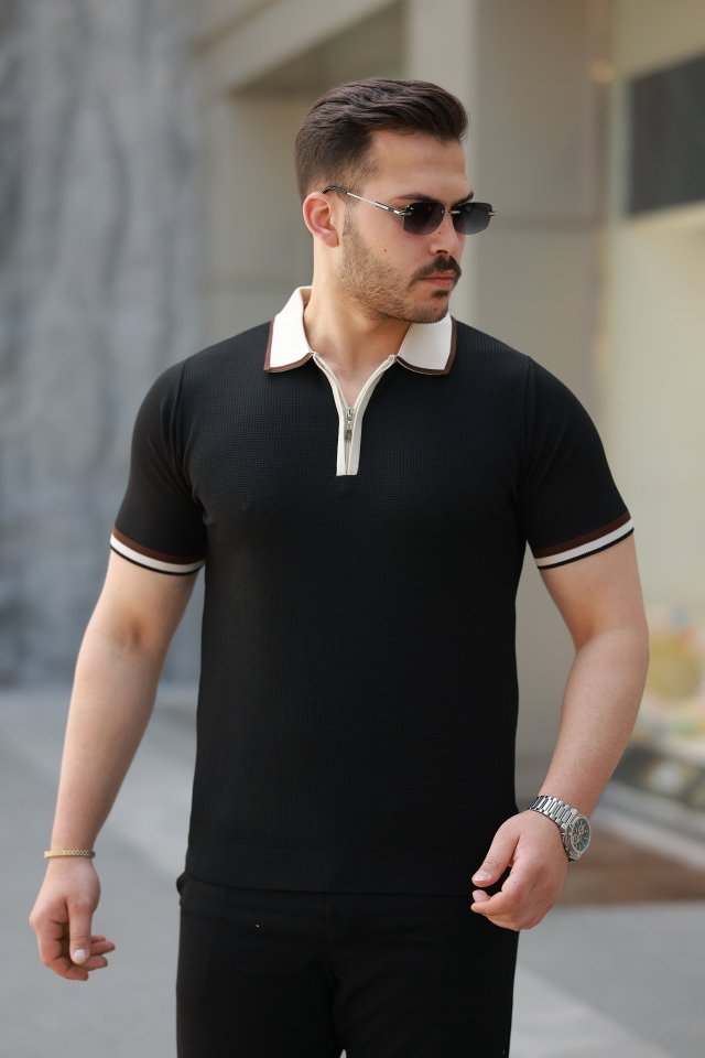 Erkek Göğüs Pirinç Desenli Fermuar Yakalı Kısa Kollu Tişört