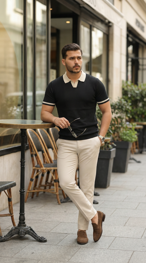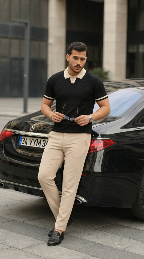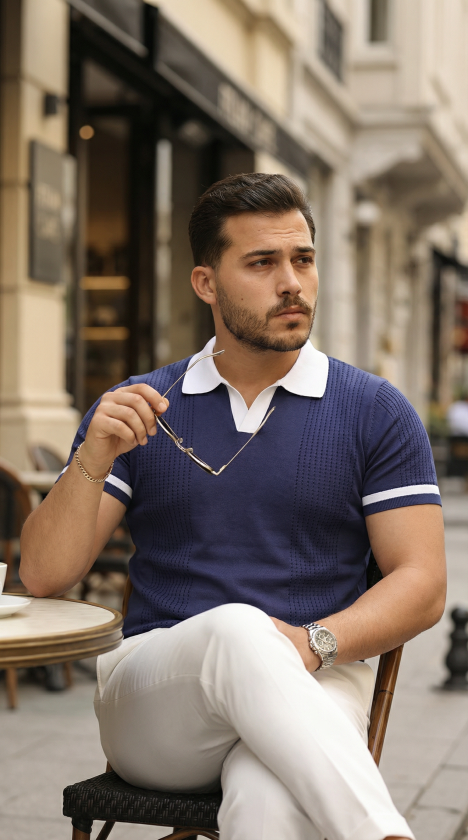 Erkek Renkli Yakalı File Desenli Kısa Kollu Tişört