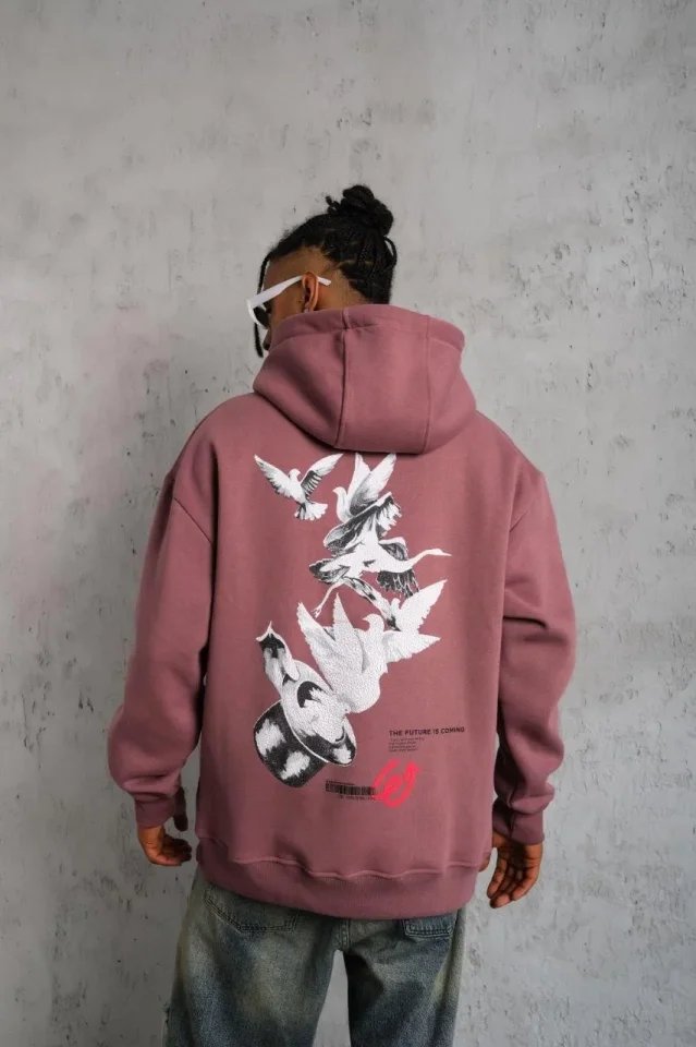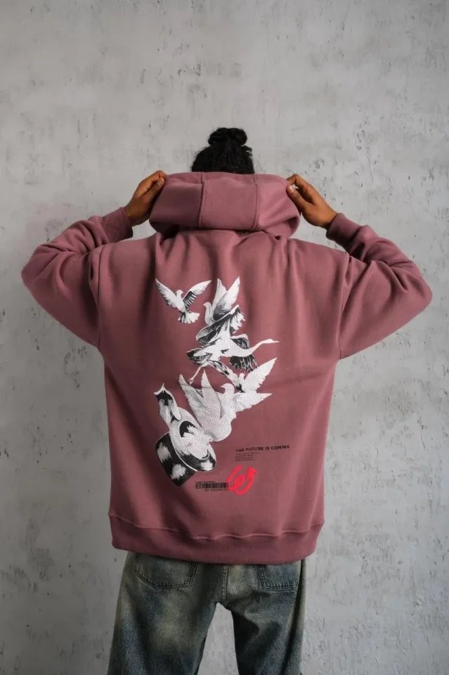 Erkek Şapkalı Güvercin Baskılı Kapşonlu Sweat – Gül Kurusu
