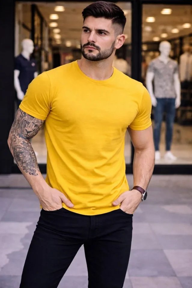 Erkek T-Shirt Bisiklet Yaka Slim Fit Dar Kesim Likralı Tişört Günlük Basic Body – Sarı