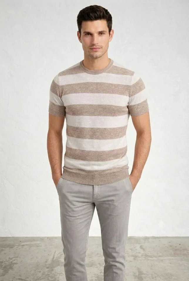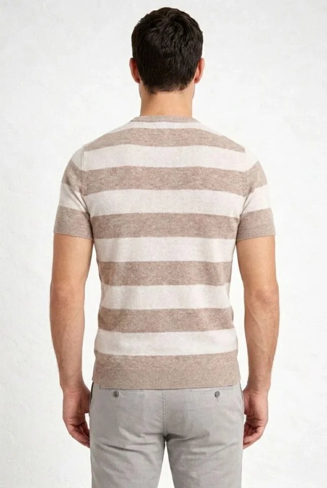 Erkek T-shirt Çizgili Triko Dokuma Bisiklet Yaka Tişört – Bej