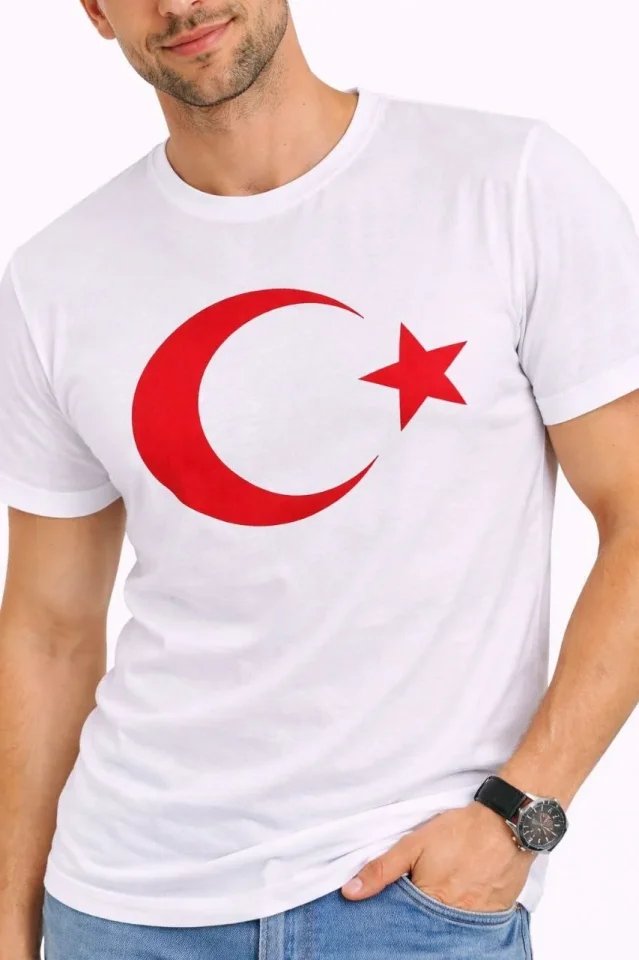Erkek T-Shirt Kısa Kol Bisiklet Yaka Ay Yıldız Bayrak Baskılı Tişört – Beyaz