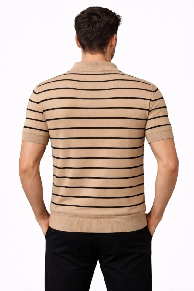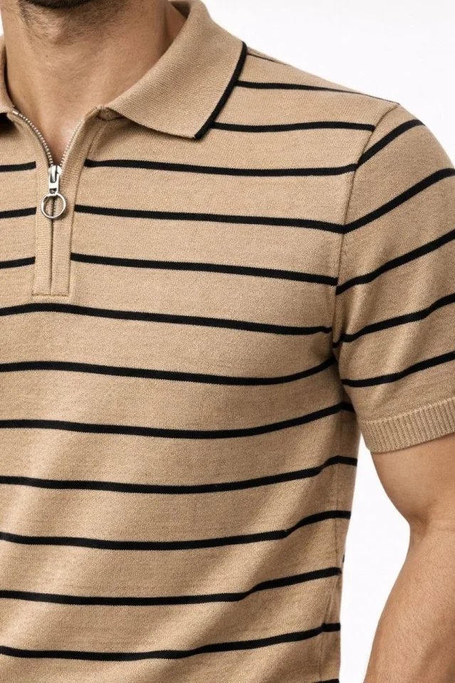 Erkek Triko Polo Yaka Fermuarlı Çizgili Tişört T-Shirt Yazlık Şık – Kahverengi
