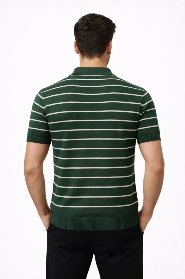 Erkek Triko Polo Yaka Fermuarlı Çizgili Tişört T-Shirt Yazlık Şık – Yeşil