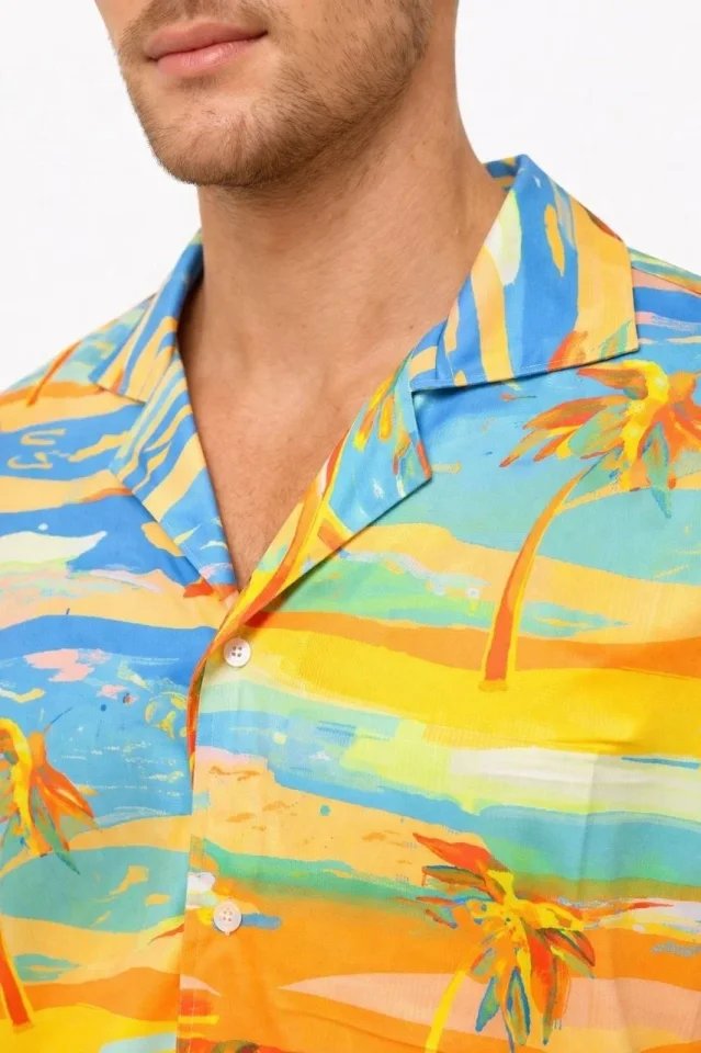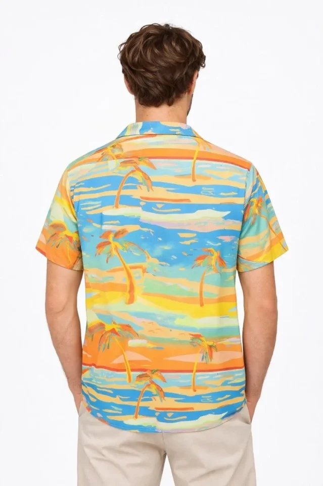 Erkek Tropikal Palmiye Desenli Kısa Kol Gömlek Yazlık Beach Tarz Rahat Kalıp – Desenli