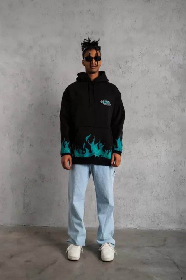 Erkek Üç İplik İçi Pamuklu Alev Baskılı Kapüşonlu Sweatshirt – Siyah