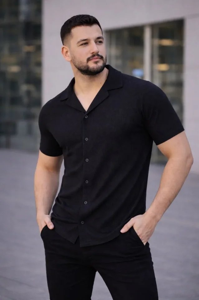 Erkek Waffle Dokuma Açık Yakalı Düğmeli Regular Kalıp 2’li Gömlek Seti – Siyah – Beyaz