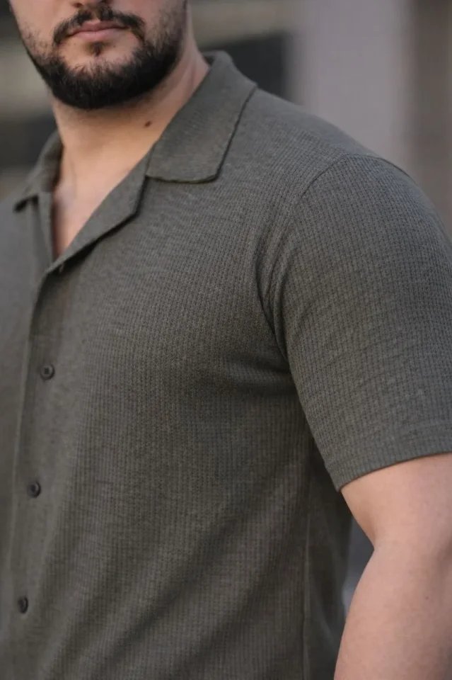 Erkek Waffle Kumaş Kısa Kollu Düğmeli Açık Yaka Regular Fit Gömlek – Haki