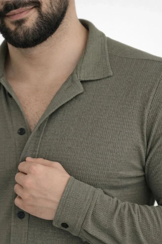 Erkek Waffle Kumaş Uzun Kollu Düğmeli Açık Yaka Regular Fit Gömlek – Haki