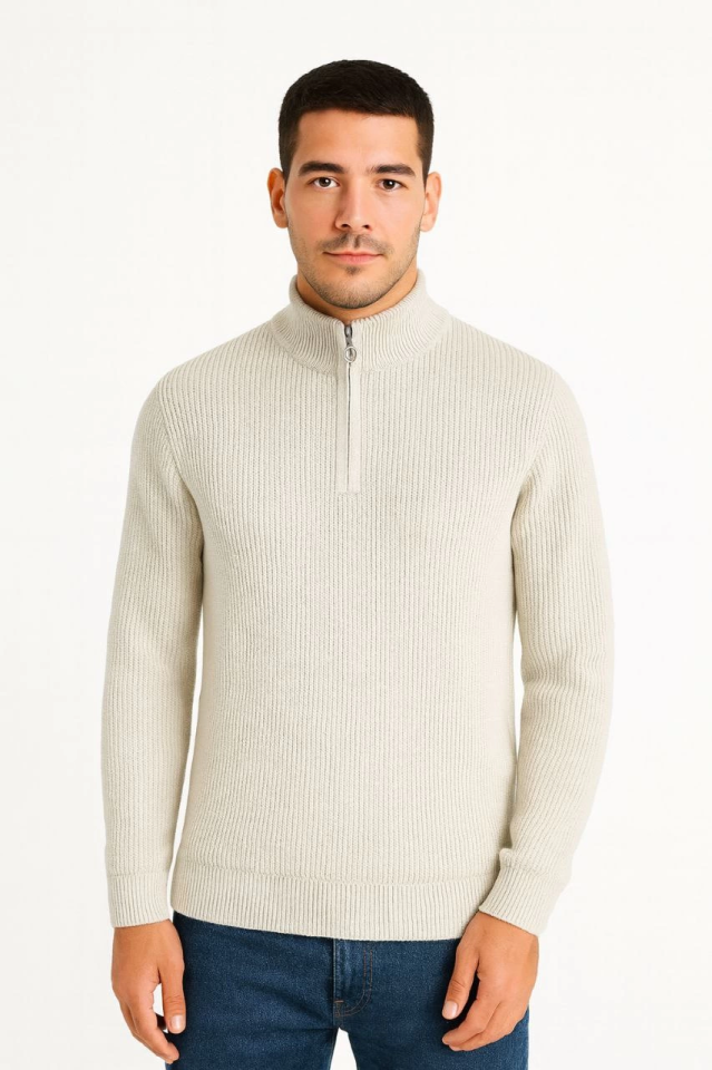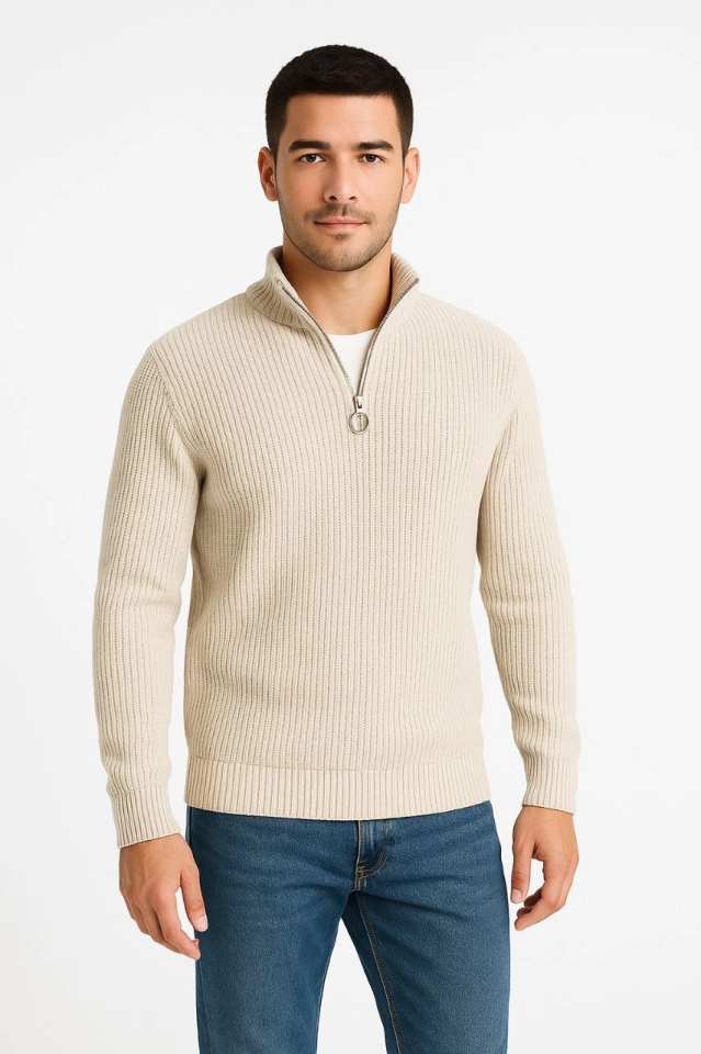 Erkek Yarım Fermuarlı Triko Kazak – Selanik Örgü, Dik Yaka, Pamuklu Dokuma, Regular Fit Uzun Kollu Kışlık Model – Bej