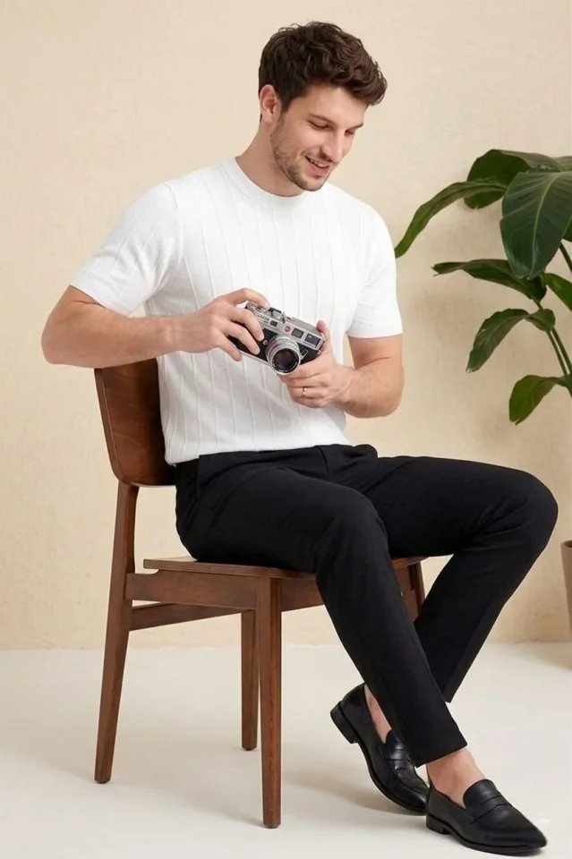 Erkek Yazlık Fitilli Triko Tişört Kısa Kol Bisiklet Yaka T-Shirt – Beyaz