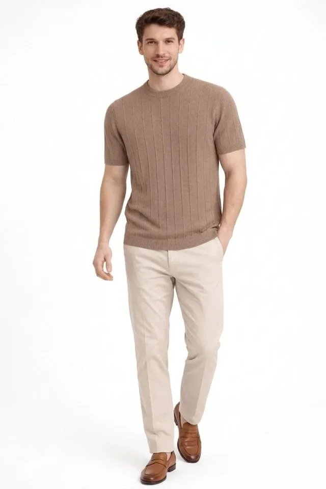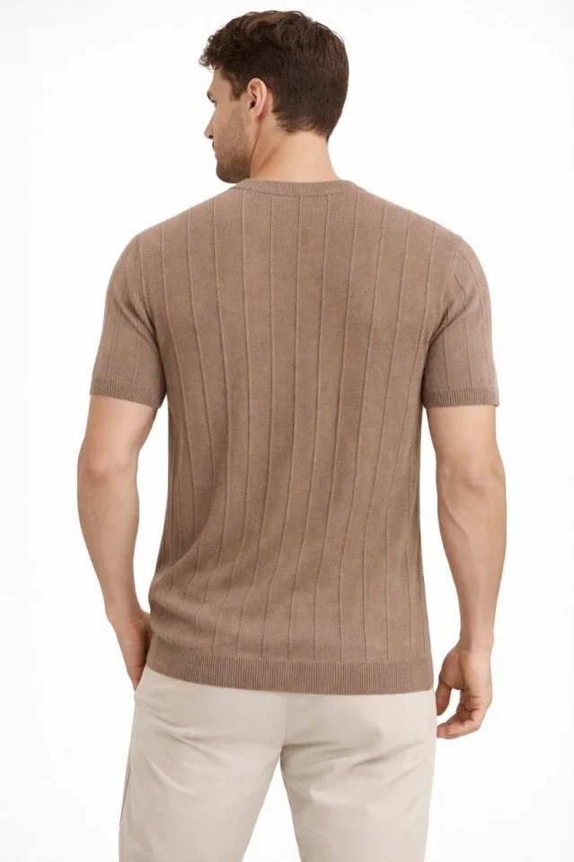Erkek Yazlık Fitilli Triko Tişört Kısa Kol Bisiklet Yaka T-Shirt – Kahverengi