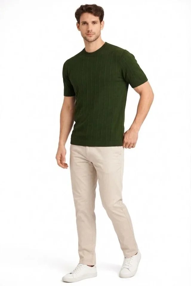 Erkek Yazlık Fitilli Triko Tişört Kısa Kol Bisiklet Yaka T-Shirt – Haki