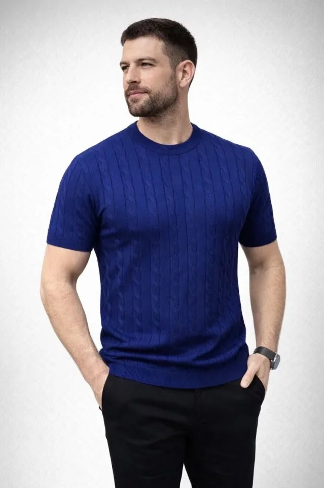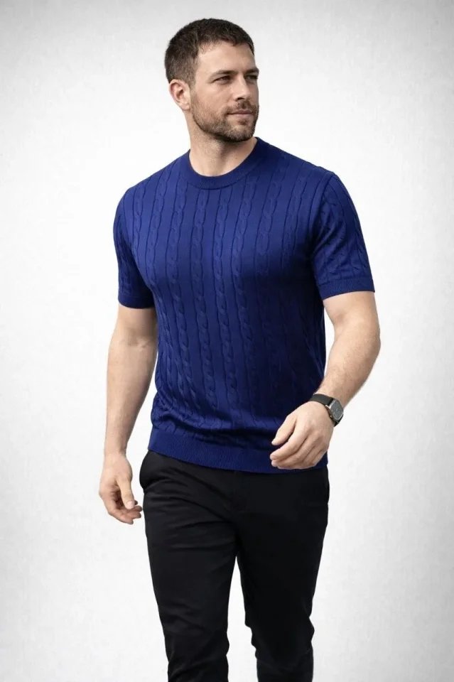 Erkek Yazlık Triko Dokuma Tişört Kısa Kol Bisiklet Yaka Örgü Desenli T-Shirt – Lacivert