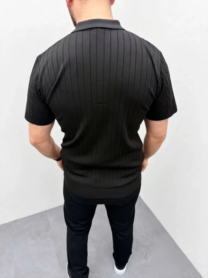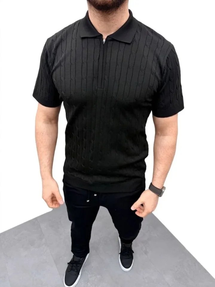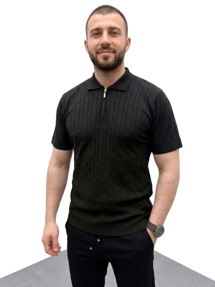 Erkek Yazlık Triko Saç Örgü Tişört Kısa Kol Polo Yaka Fermuarlı T-Shirt – Siyah