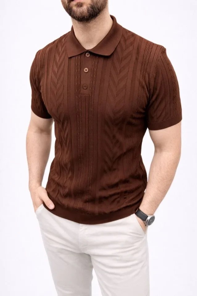 Erkek Yazlık Triko Tişört Kısa Kol Polo Yaka Düğmeli T-Shirt – Kahverengi