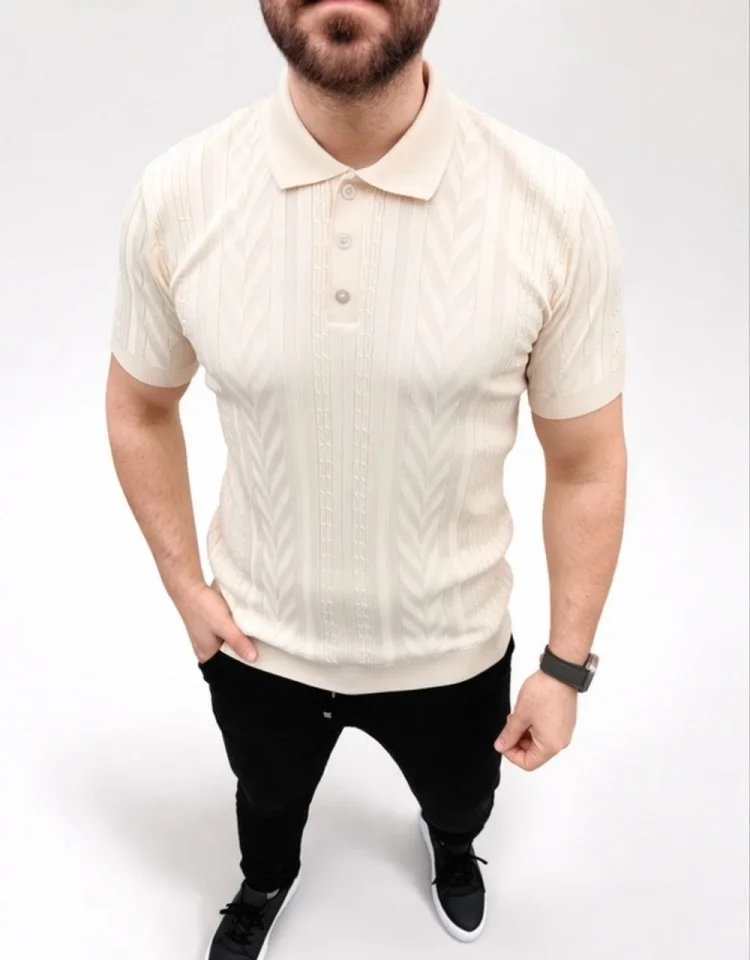 Erkek Yazlık Triko Tişört Kısa Kol Polo Yaka Düğmeli T-Shirt – Krem