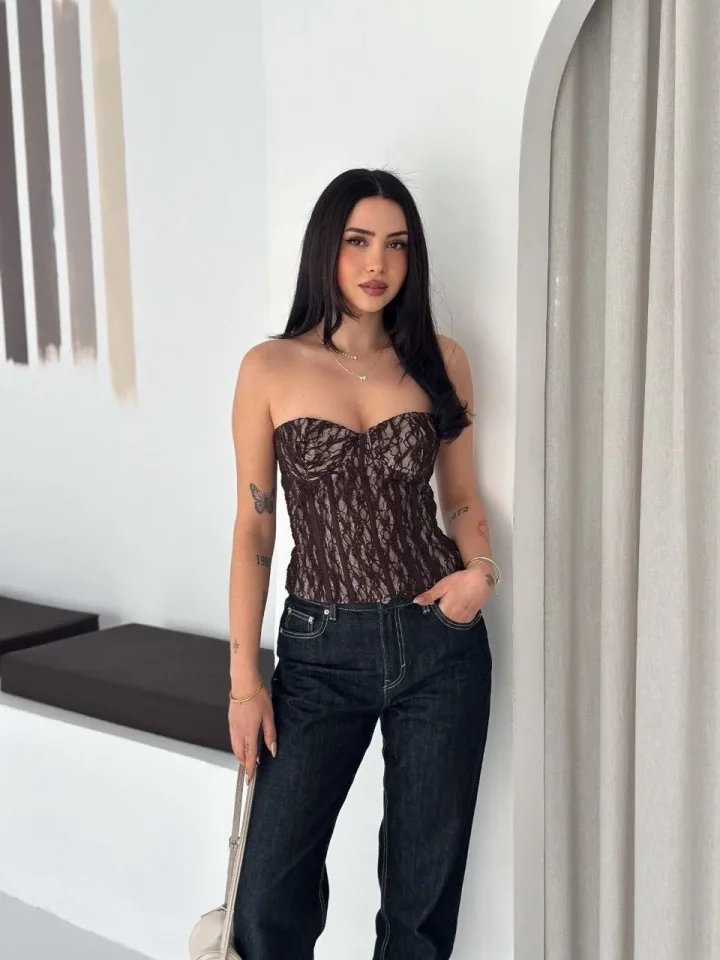 Fermuarlı Dantel Korse Straplez Bustiyer Transparan Şık Top – Kahverengi