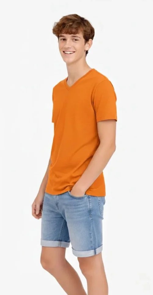 Genç Erkek Çocuk V Yaka Tişört Yazlık Model Günlük Basic Body – Turuncu