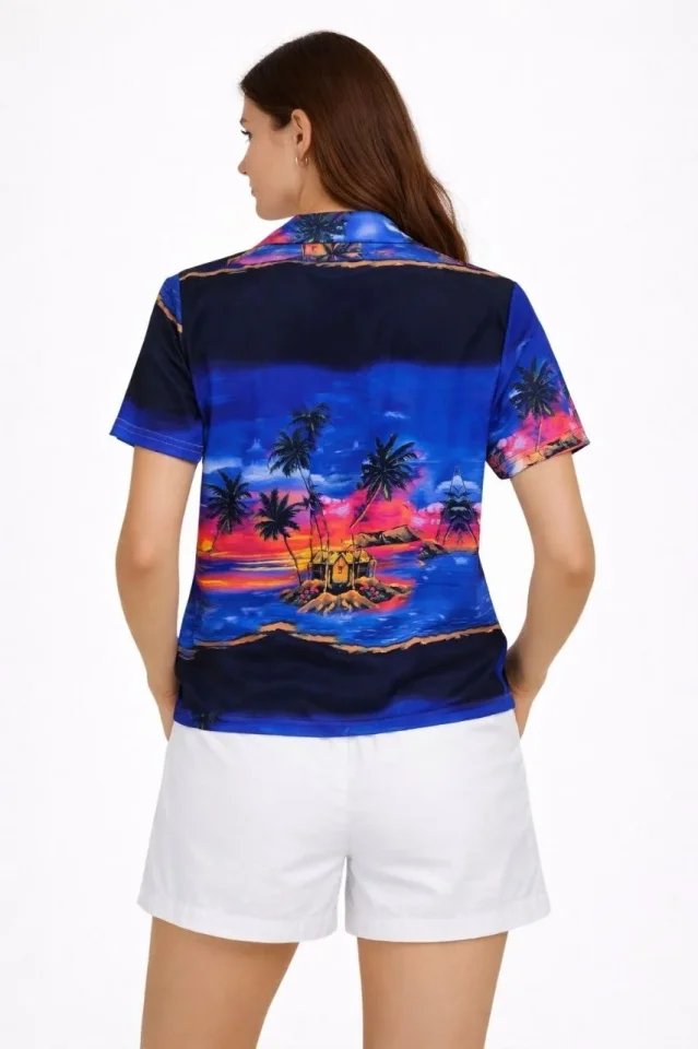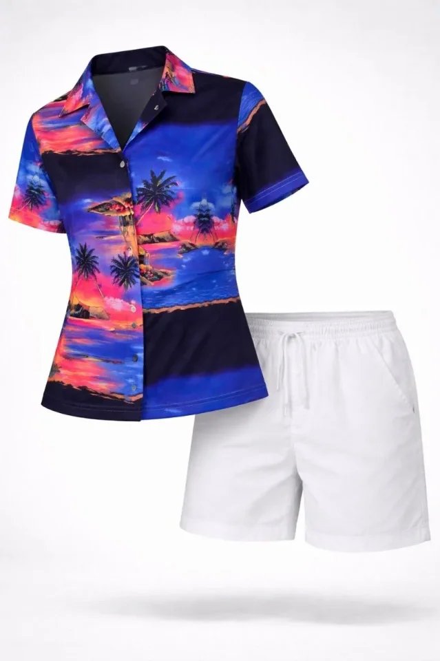Gün Batımı Tropikal Desenli Kısa Kol Gömlek Şort Takım Yazlık Rahat Kalıp – Desenli