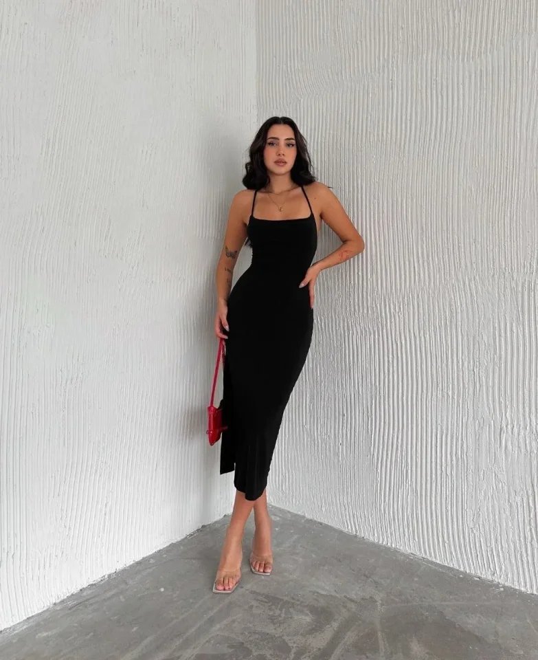 İp Askılı Sırt Dekolteli Bağlama Detaylı Yırtmaçlı Midi Elbise – Siyah